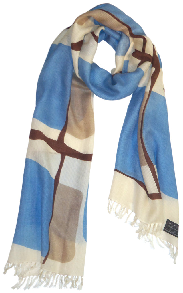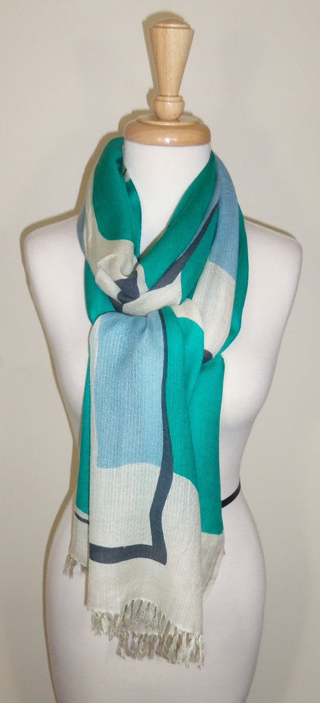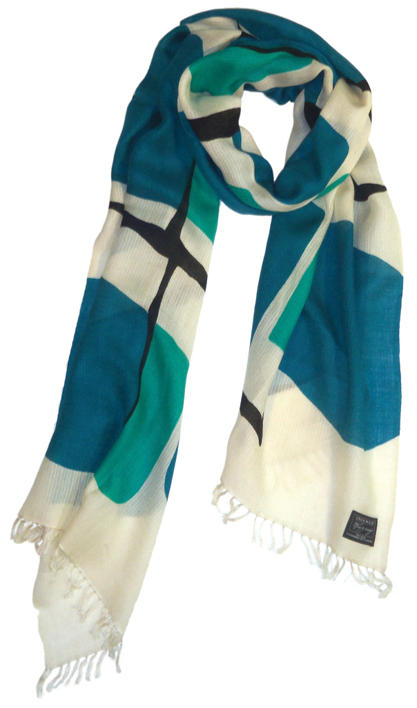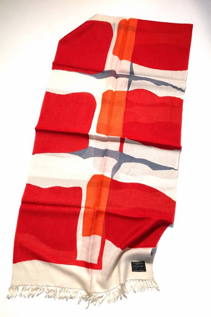A bold nod to mid century modern design, this scarf features a graphic retro inspired pattern with confident blocks of color and hand drawn linework that feels both playful and architectural the composition recalss lassic modernist textiles- clean, expressive and effortlessly timeless.